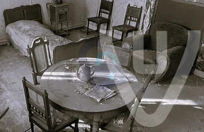 La Ferme des Cieux se encuentra en la provincia de Limburgo, Bélgica. El sitio presenta un interior ruinoso caracterizado por la pintura descascarada y suelos de baldosas de piedra desgastados por el paso del tiempo. Dentro de la estructura hay una habitación con una puerta blanca, una verja metálica negra y una ventana con flores rosas. El edificio muestra signos de abandono y abandono considerables, y la estructura subyacente es visible a través de las paredes deterioradas.
